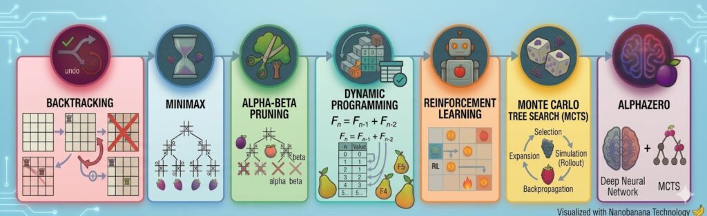 25 structured lessons covering python, game programming, search algorithms, historic chess & AI puzzles, and modern AI, including Stockfish, reinforcement learning, MonteCarlo tree search, and AlphaZero